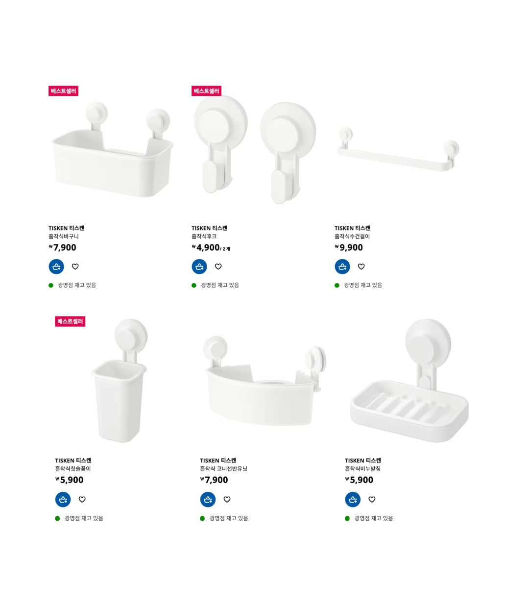 이케아의 티스켄 시리즈는 강력한 흡착판을 바탕으로 전개한 욕실용품 시리즈다. 보기 드문 형태의 흡착판인데 타일과 유리에 압축을 몇 번 하면 최대 3kg까지 견딜 수 있다고 한다. 웬만한 욕실 용품은 거뜬하며, 못 박은 것처럼 단단히 고정된다. 종류도 다양한데 수납 바구니, 수건걸이, 코너선반, 비누받침, 휴지걸이, 샤워기 거치대까지 욕실에 구멍 하나 뚫지 않고도 세팅이 가능하다.