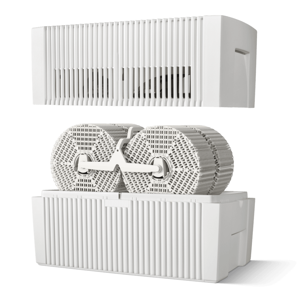 작동 방식은 자연 기화식이다. 내부의 디스크가 천천히 회전하며 물 표면에 수분막을 만들고, 공기 중의 먼지·가스 등 오염물질을 물에 흡착시켜 하부 수조에 침전시킨다. 정화된 공기는 다시 밖으로 빠져나오면서 공간의 습도를 40~60%로 유지한다. 온실처럼 과도하게 습하게 만드는 초음파식과 달리 '쾌적한 습도'를 자연스럽게 만든다는 점이 특징이다.